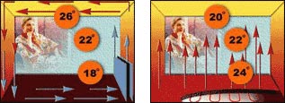 Так как теплый воздух всегда стремится подняться вверх и замещается более холодным, то теплые полы, благодаря тому, что источник тепла находится прямо под вашими ногами, создают максимально комфортные условия, когда "ноги в тепле, а голова в холоде". Обычно при использовании этого вида отопления температура на уровне пола примерно на 3 градуса выше, чем на уровне головы. ![]() Температура на разных высотах помещения при использовании радиаторов (конвекторов) и теплого пола Так как температура пола не может быть очень высокой (не более 30 °С), то для отопления всего помещения теплых полов обычно недостаточно. Чаще всего напольное отопление используется как дополнительное - для повышения комфорта. При хорошо утепленном помещении отопление с помощью теплых полов может стать и основным. К достоинствам отопления при помощи теплого пола можно отнести также то, что в помещении не занимается полезная площадь и не портится интерьер.